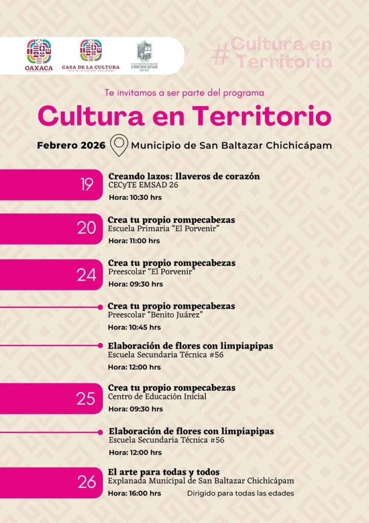 Oaxaca de Juárez, Oax. 18 de febrero de 2026.- Con el objetivo de ejercer el derecho cultural y atender las causas que generan violencia en la población, del 19 al 26 de febrero, la Casa de la Cultura Oaxaqueña (CCO) realizará el programa Cultura en Territorio en el municipio de San Baltazar Chichicápam.