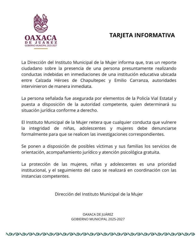 El Instituto Municipal de la Mujer reitera que cualquier conducta que vulnere la integridad de niñas, adolescentes y mujeres debe denunciarse formalmente para que se realicen las investigaciones correspondientes.